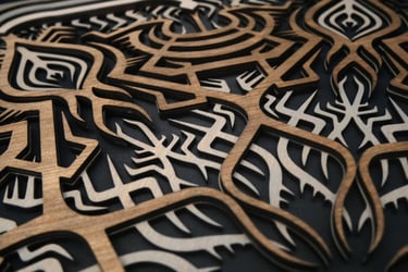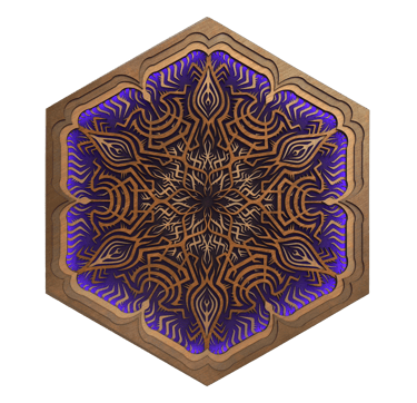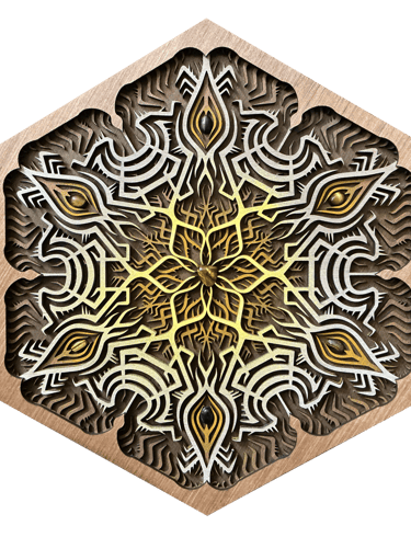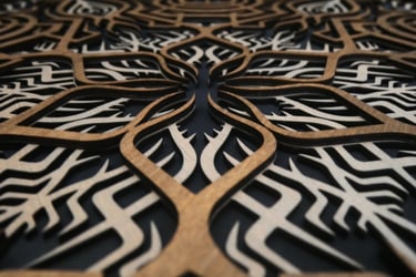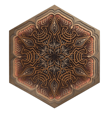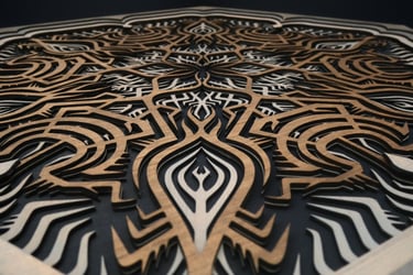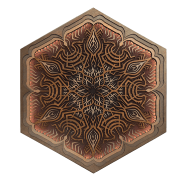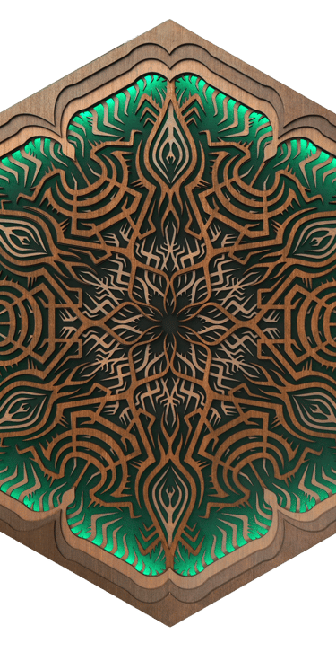 Unlit, the piece reveals a clean, graphic pattern through the contrast of laser-cut wood on a black background.