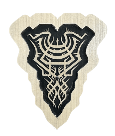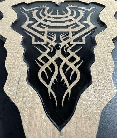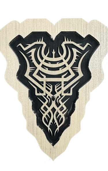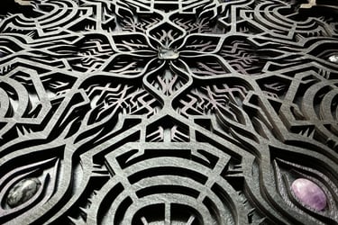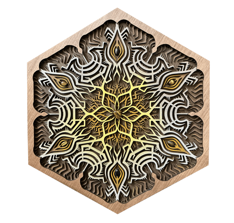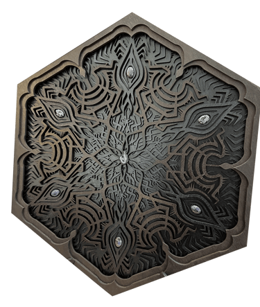 These motifs, drawn from the HexaVision series, enter a dimension inspired by ancestral symbolic traditions. Captured and suspended within a translucent material, they reveal forms emerging from invisible worlds. Drop-shaped rock crystals enhance the energy and mystical presence of the composition.