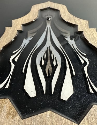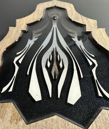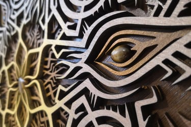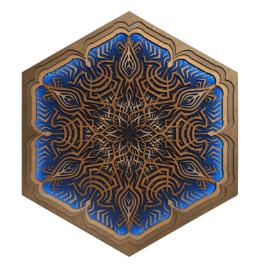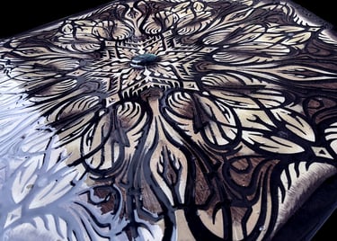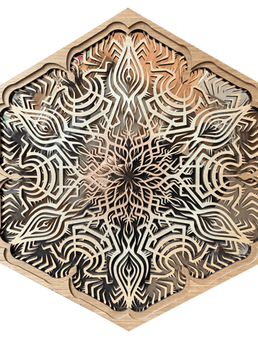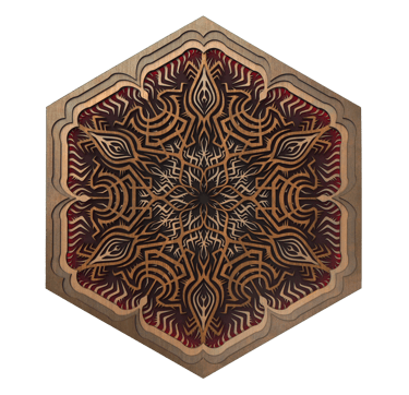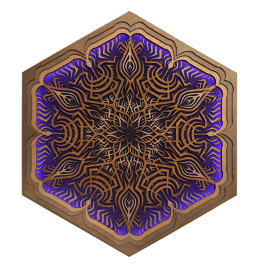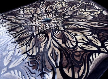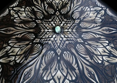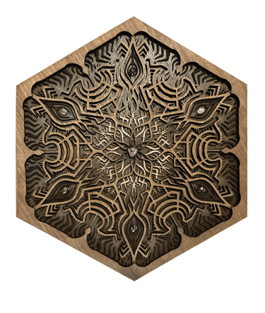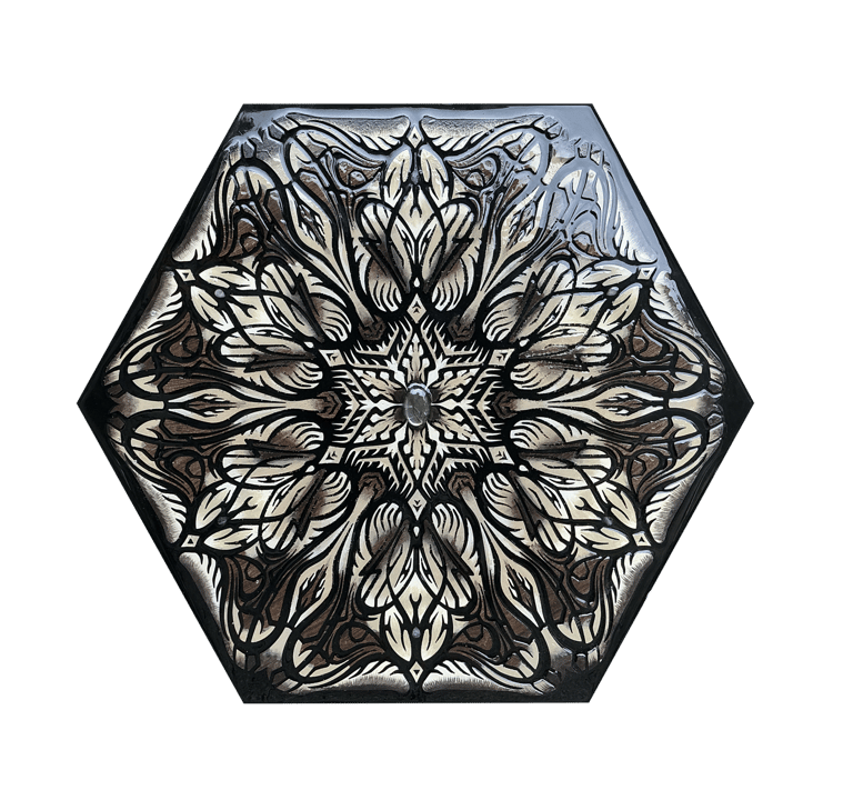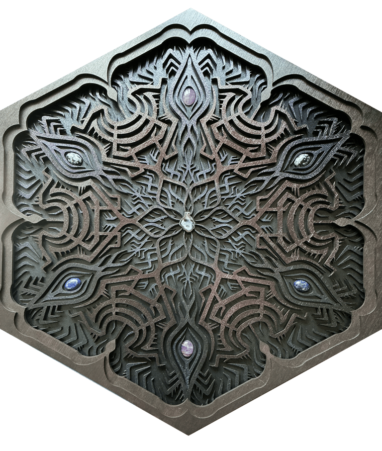 These motifs, taken from the HexaVision series, explore a dimension inspired by Amazonian shamanism. This subseries, titled “Kiné” and “Tsensak”, is captured and preserved within an epoxy-filled frame, revealing forms emerging from invisible worlds. Droplet-shaped rock crystals amplify the energy and mystical presence of the composition.