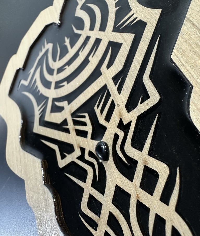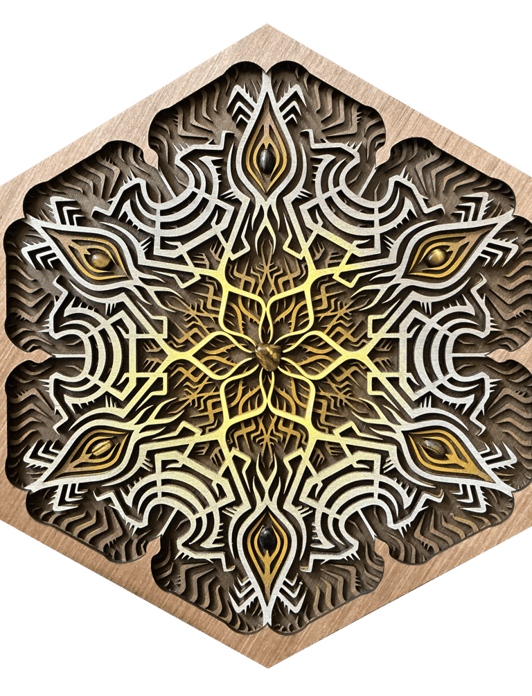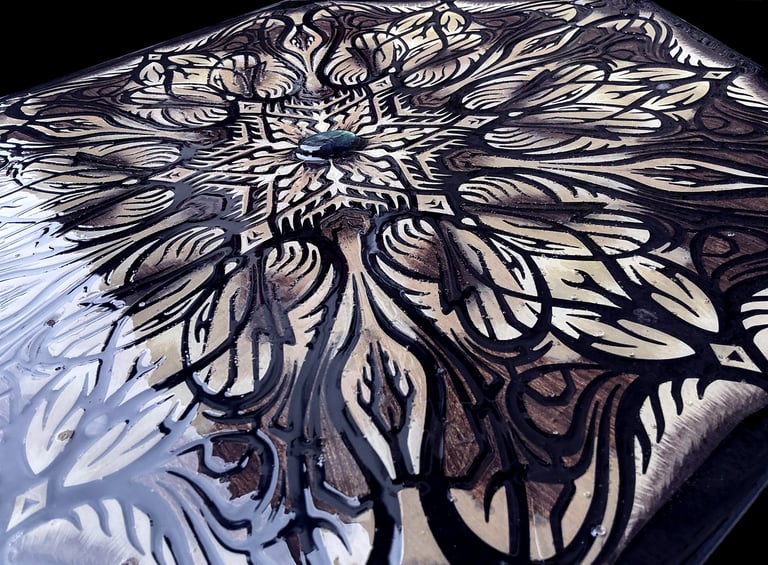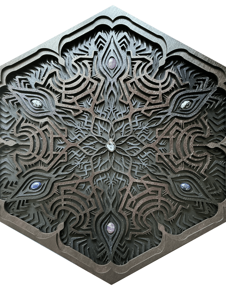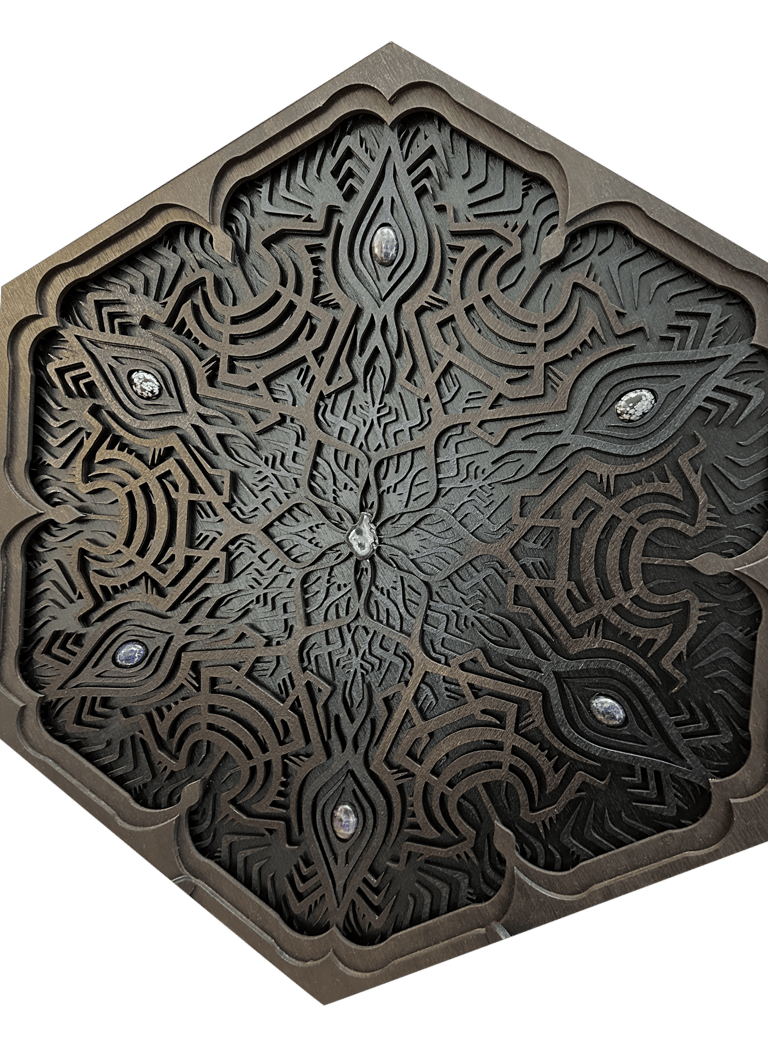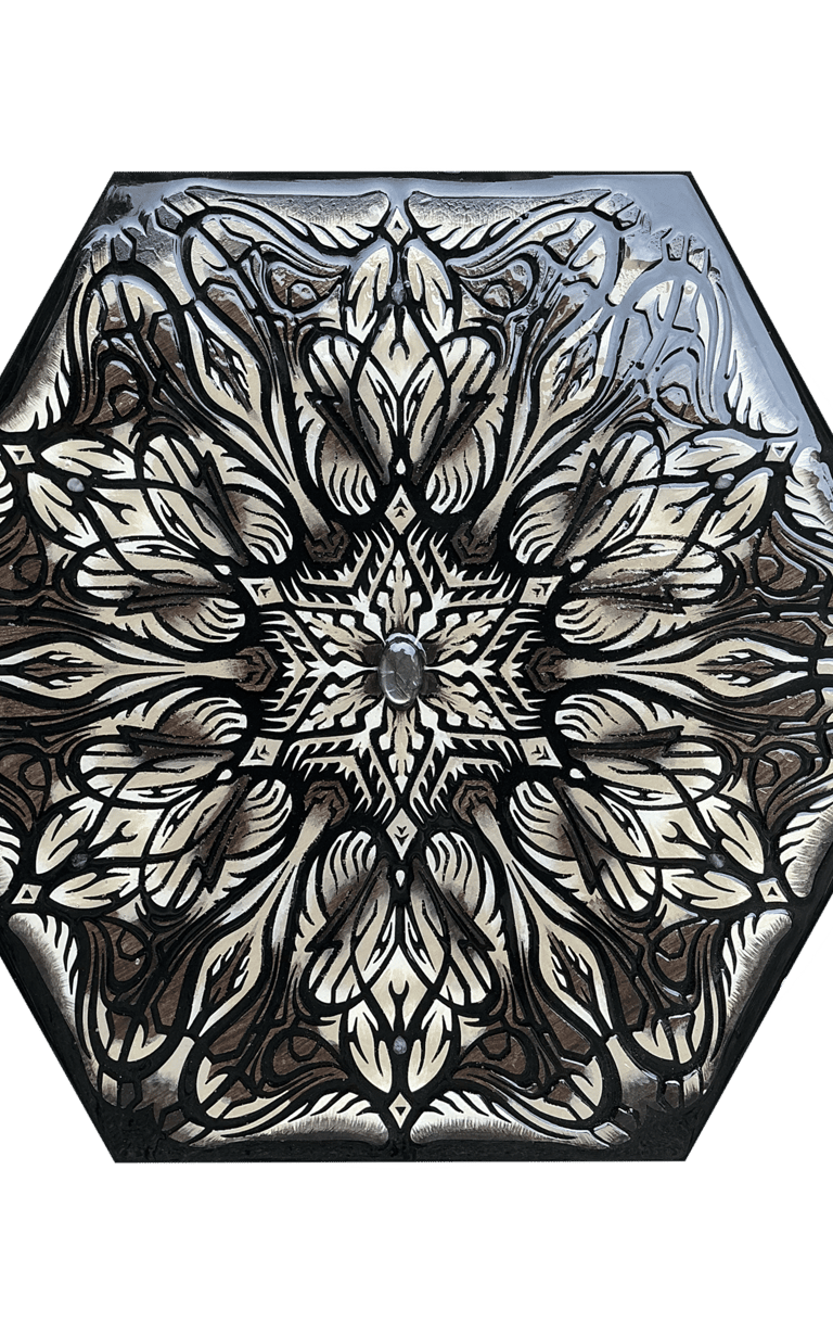 These motifs, taken from the HexaVision series, explore a dimension inspired by Amazonian shamanism. This subseries, titled “Kiné” and “Tsensak”, is captured and preserved within an epoxy-filled frame, revealing forms emerging from invisible worlds. Droplet-shaped rock crystals amplify the energy and mystical presence of the composition.