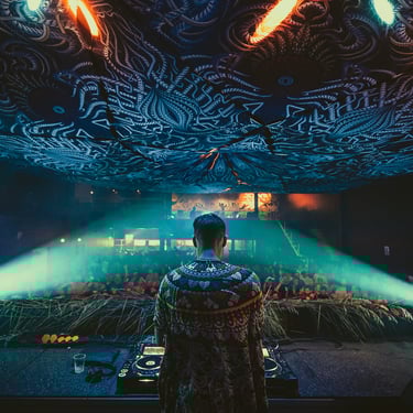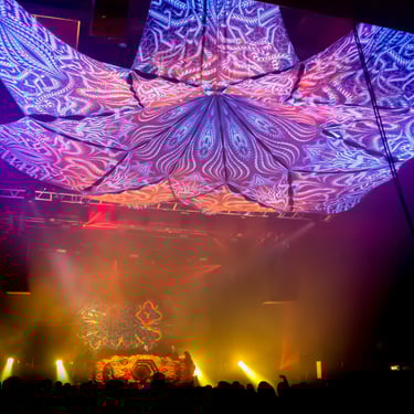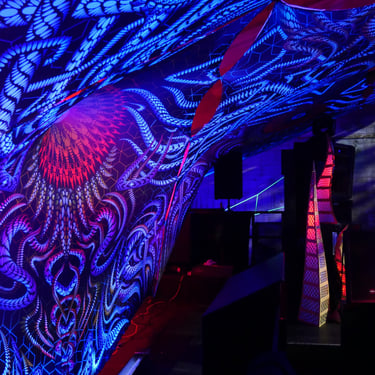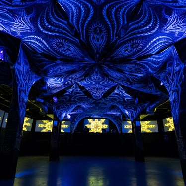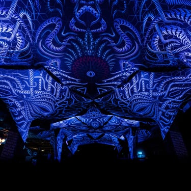 Canopy Explore my canopy installations, crafted from stretch fabric printed digitally with the cut patterns from my "Anonymous Substances" project. These unique works can adapt to the architecture of spaces, creating immersive environments that transform the area.