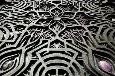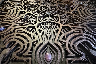 Chaque pièce invite le regard à explorer un espace entre visible et invisible, entre matière, lumière et symboles sacrés.