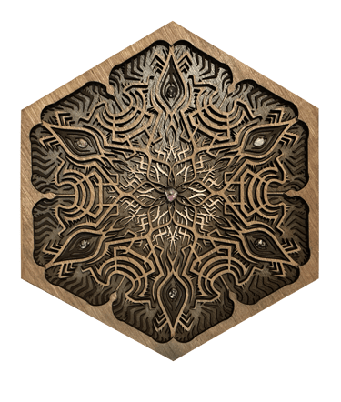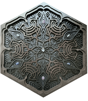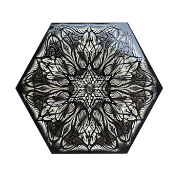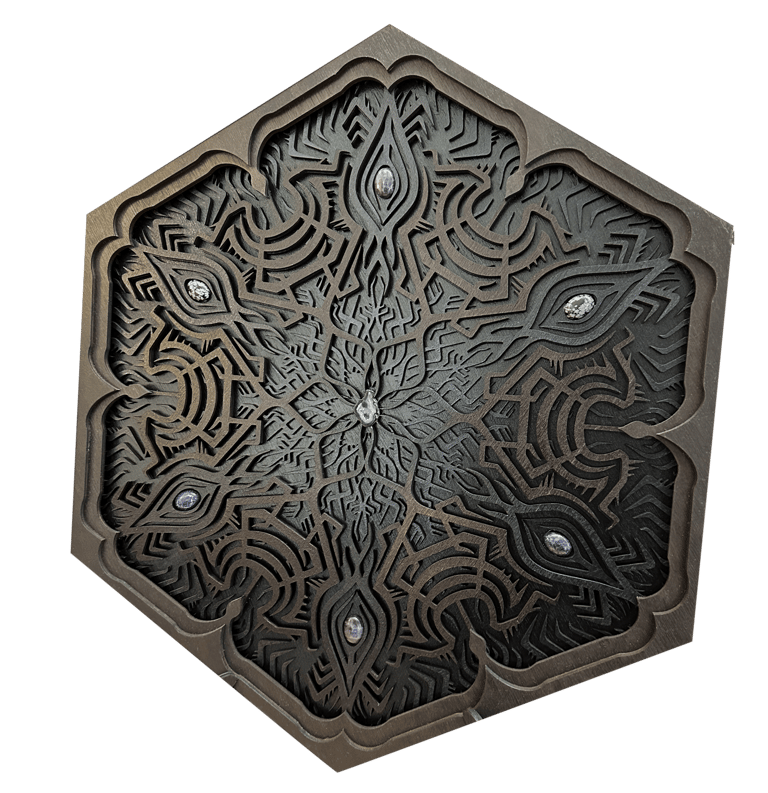 Ces motifs, extraits de la série HexaVision, plongent dans une dimension inspirée des traditions symboliques et des savoirs ancestraux. Capturés et suspendus dans une matière translucide, ils révèlent des formes issues des mondes invisibles. Des cristaux de roche en forme de goutte viennent amplifier l’énergie et la présence mystique de l’ensemble.