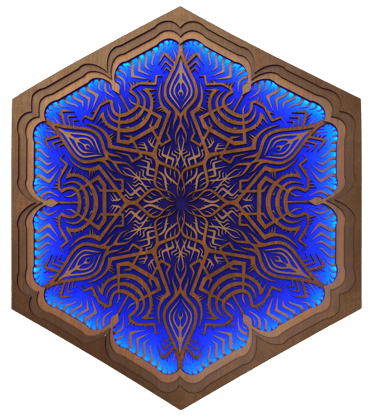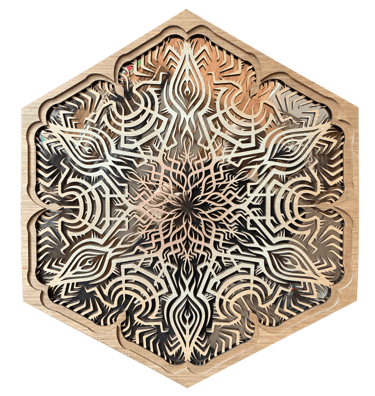 Non éclairée, la pièce révèle un motif épuré et graphique grâce au contraste du bois découpé au laser sur un fond noir.